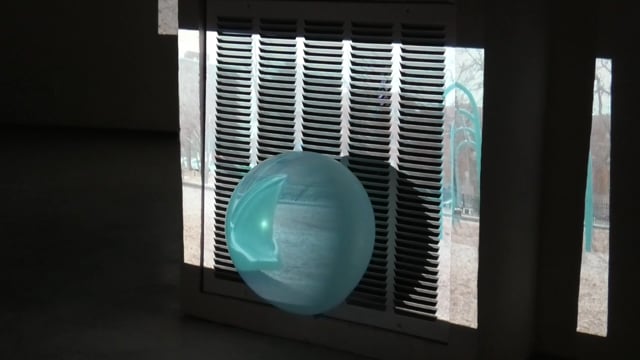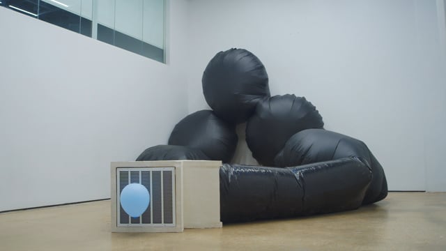 I attempt to resonate with the airflow of modern architecture. This work is a singular piece with its mechanism. This installation object is a self-made ventilation system made of an ouroboros-like black inflatable attached to a white cube with a vent covering its opening. The blue balloon is sucked against the vent by the airflow, involuntarily floating and dancing on the air vent. Both the action of the balloon dancing and the black inflatable material is a triggers making the invisible airflow visible. The blue balloon’s delightful movement poses: Is the balloon autonomous?